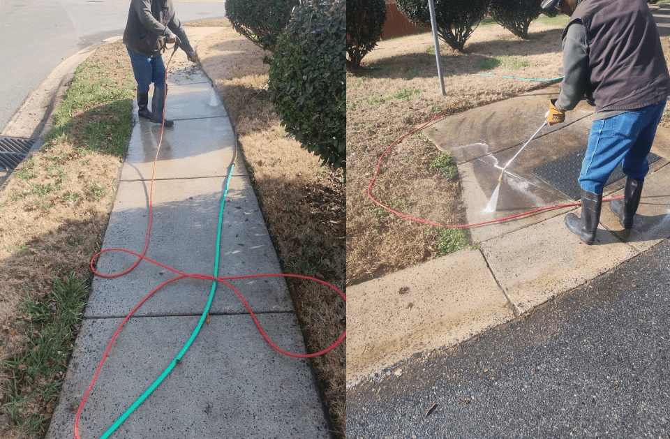 Sidewalks are thoroughly cleaned to eliminate grime and buildup, creating a safe and welcoming walkway.